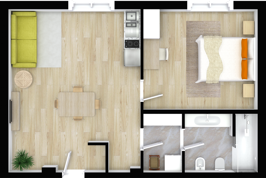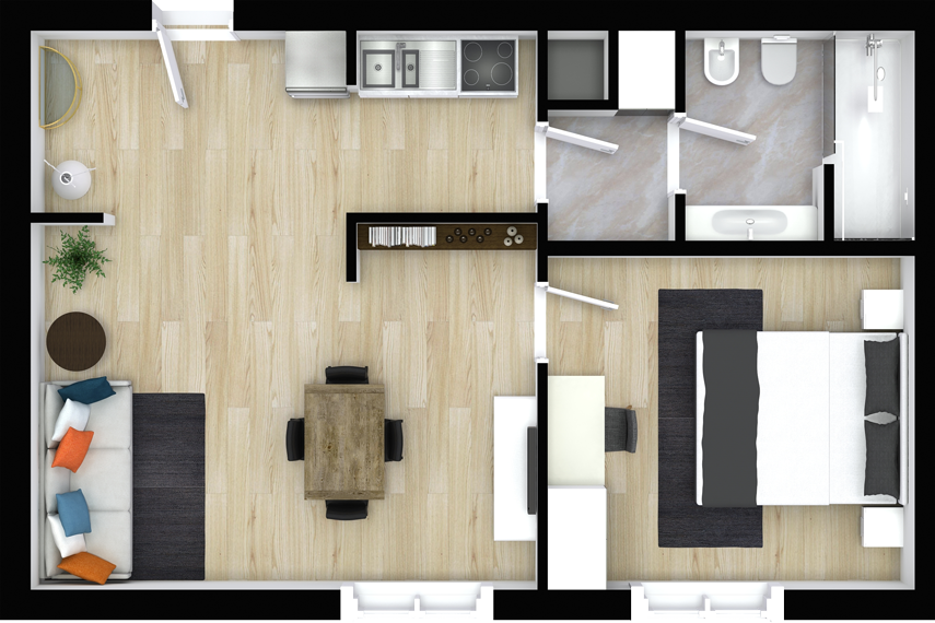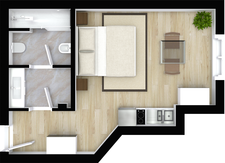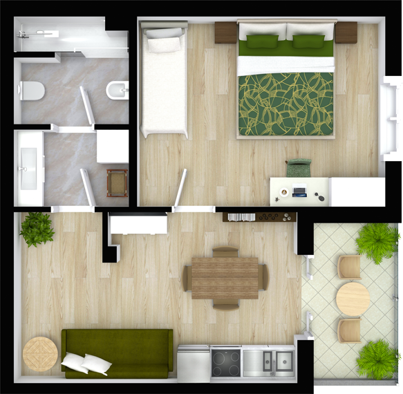 L’appartamento può ospitare 2 persone, è composto da sala con cucina e letto, antibagno, bagno