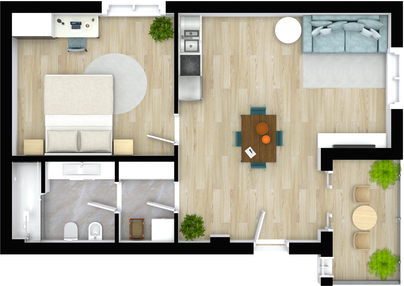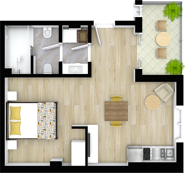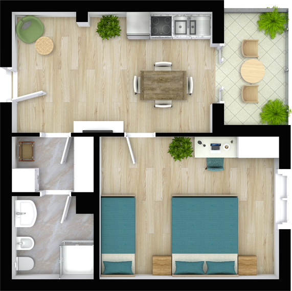 L’appartamento può ospitare 2 persone, è composto da sala con cucina e letto, antibagno, bagno e balconcino.